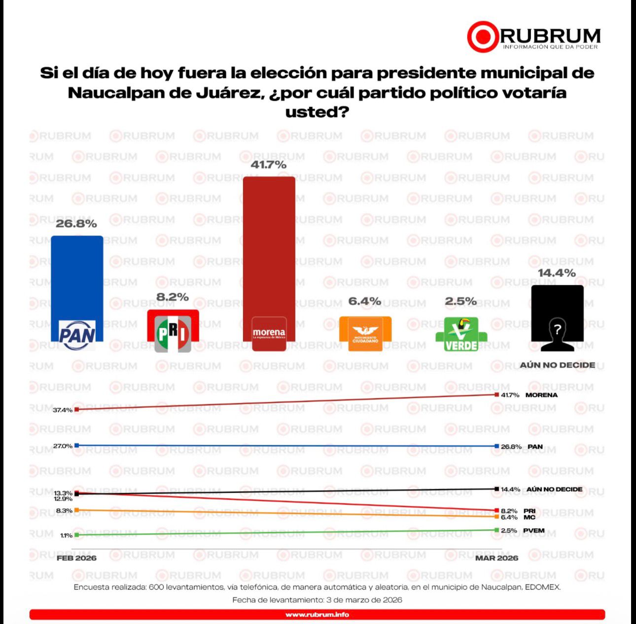 El dinamismo administrativo de un gobierno de resultados ha tenido un eco directo en la opinión, como lo refleja la pregunta ¿si el día de hoy fuera la elección de presidente municipal de Naucalpan, por qué partido votaría, MORENA está adelante con el 41.7%, contra su más cercano competidor el PAN 26.8%. Los estudios de la empresa RUBRUM destacan que en febrero MORENA tenía 37.4 por ciento y ascendió más de 4 puntos, mientras que el PAN descendió.