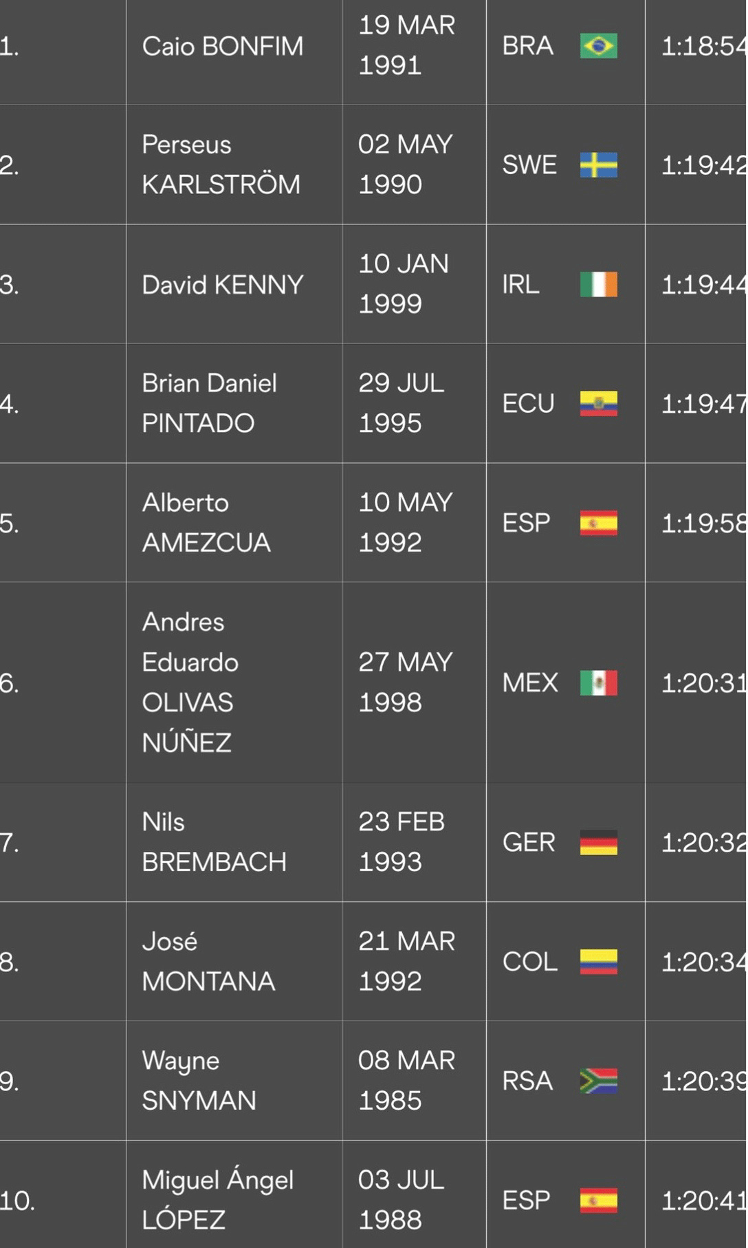 En cambio en la libre varonil de 20 kilómetros, el mexicano mejor ubicado fue Andrés Eduardo Olivas Núñez, sexto lugar con un tiempo de 1:20:31 poco más de un minuto después de los primeros tres lugares que fueron Brasil Caio Bonfim 1:18:55; de Suecia Perseus Karlstrom 1:19:42 e Irlanda David Kenny 1:19:44.