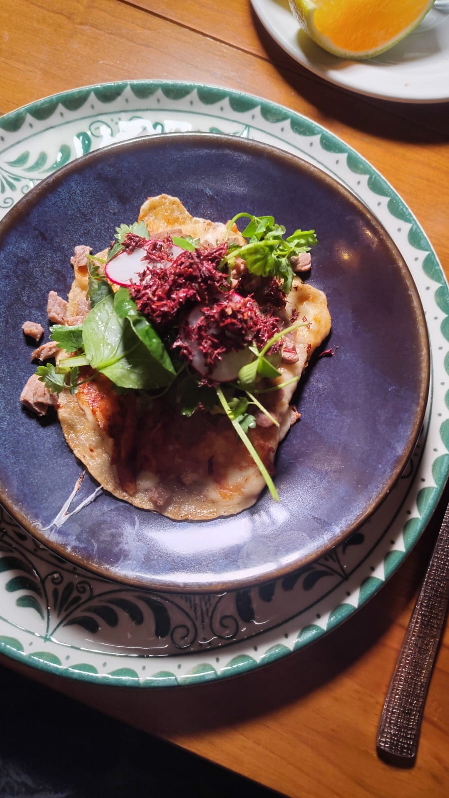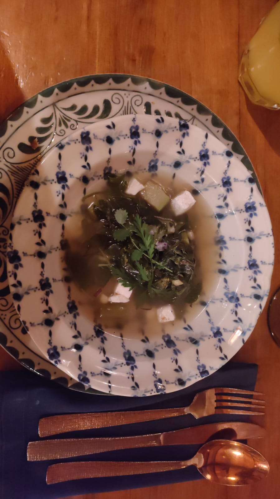 De entrada fue una sopa de campo y siguieron tacos de chapulines con una costra de queso, tasajo y chapulines, garnacha istmeña, todo muy… pero muy rico, pero resaltó la atención, y la presentación de los platillos no desmereció.