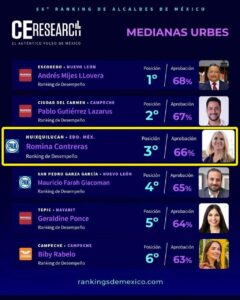 Asimismo, en el Ranking de Alcaldes de México, Medianas Urbes de Campaigns and Elections (C&E) Research, Romina Contreras obtuvo una puntuación de 66 por ciento, lo que coloca a Huixquilucan entre los tres municipios mejor calificados del país y es el que tiene mayor aprobación ciudadana en el Estado de México.