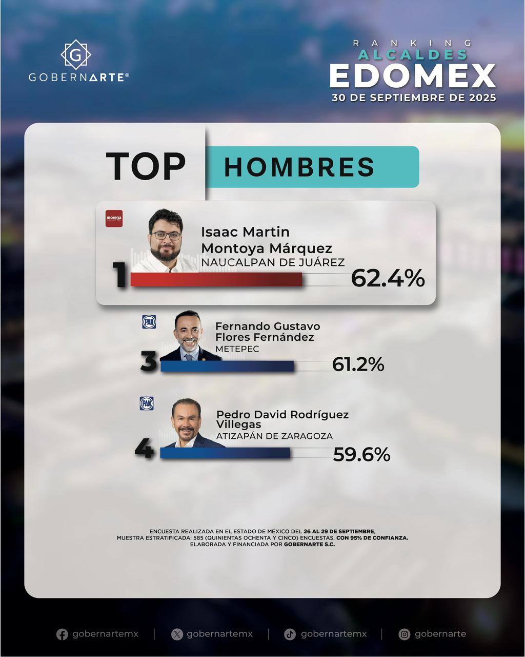 En reciente ranking de alcaldes del Estado de México, realizado por la casa encuestadora GobernArte, ubicó al presidente municipal de Naucalpan, Isaac Montoya Márquez en el primer lugar con 62.4 por ciento de aprobación gubernamental, por cercanía ciudadana y obra de impacto social.